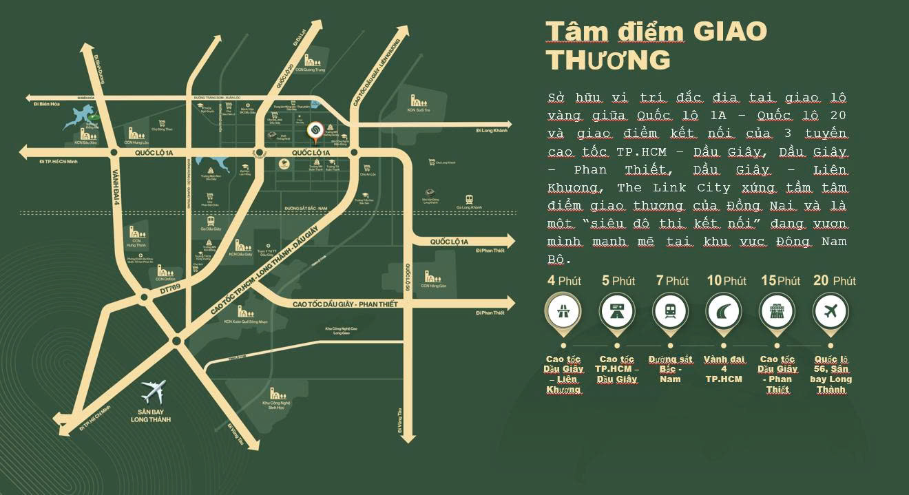 Ngoài ra, The Link City Dầu Giây còn nằm giữa các đô thị đang phát triển năng động gồm: thành phố Biên Hòa, thị trấn Trảng Bom, thị xã Long Khánh, sân bay Quốc tế Long Thành, đô thị Long Thành, đô thị Bình Sơn, hệ thống cảng quốc tế Thị Vải – Cái Mép (Bà Rịa Vũng Tàu) và nhiều khu công nghiệp – công nghệ cao. Hiện nay, nhờ có đường cao tốc TPHCM – Long Thành – Dầu Giây, thời gian di chuyển từ The Link City đến TPHCM đã được rút ngắn còn chưa đầy 1 giờ đồng hồ, đến đô thị Long Thành (Đồng Nai) chỉ trong vòng 20 phút và đến sân bay Long Thành cũng chỉ mất 10 phút, một khoảng cách rất lý tưởng để nơi đây biến thành trung tâm tập kết hàng hóa và dịch vụ cung cấp cho cả khu vực.